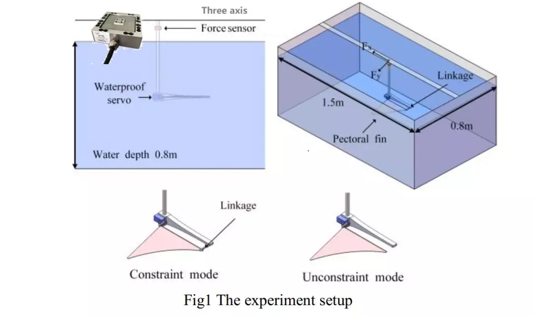 本實驗主要測試胸鰭鰭面在水下進行搖翼動作所產生的各向應力以及不同胸鰭鰭面鰭條參數對推進力產生的影響;